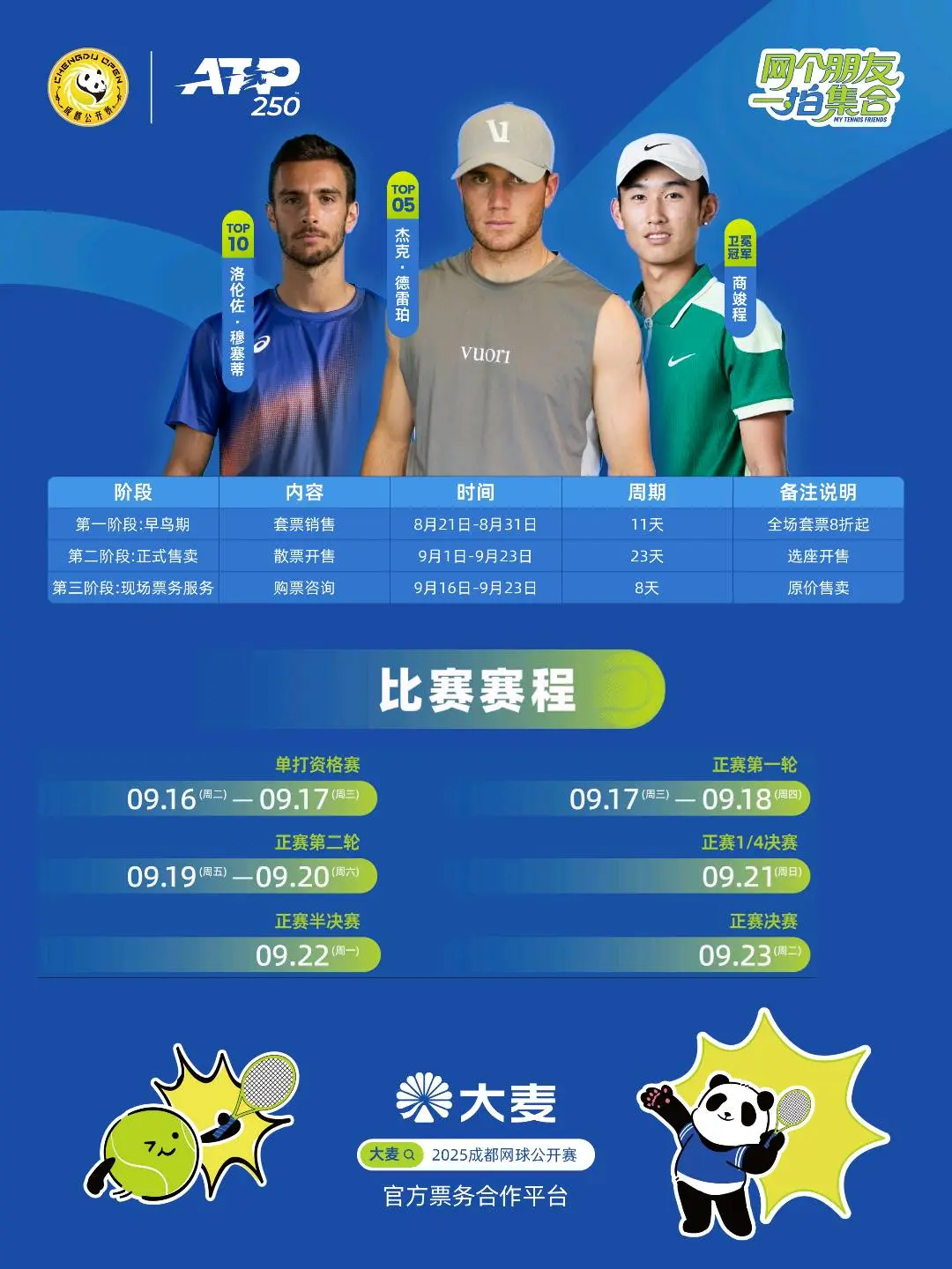 2025年景皆公开赛—ATP250将于8月21日上昼10:00,隆重开票。本年的赛事增多了更多可选门票种类,得志不同球迷的需求。非论你是入门者依然资深网球爱重者,皆能经受到恰当的门票种类。盛开“大麦”APP、微信及支付宝小重要,或拨打客服热线:1010-3721400-610-3721(使命时期:9:00-20:00),赢得满意的比赛门票。