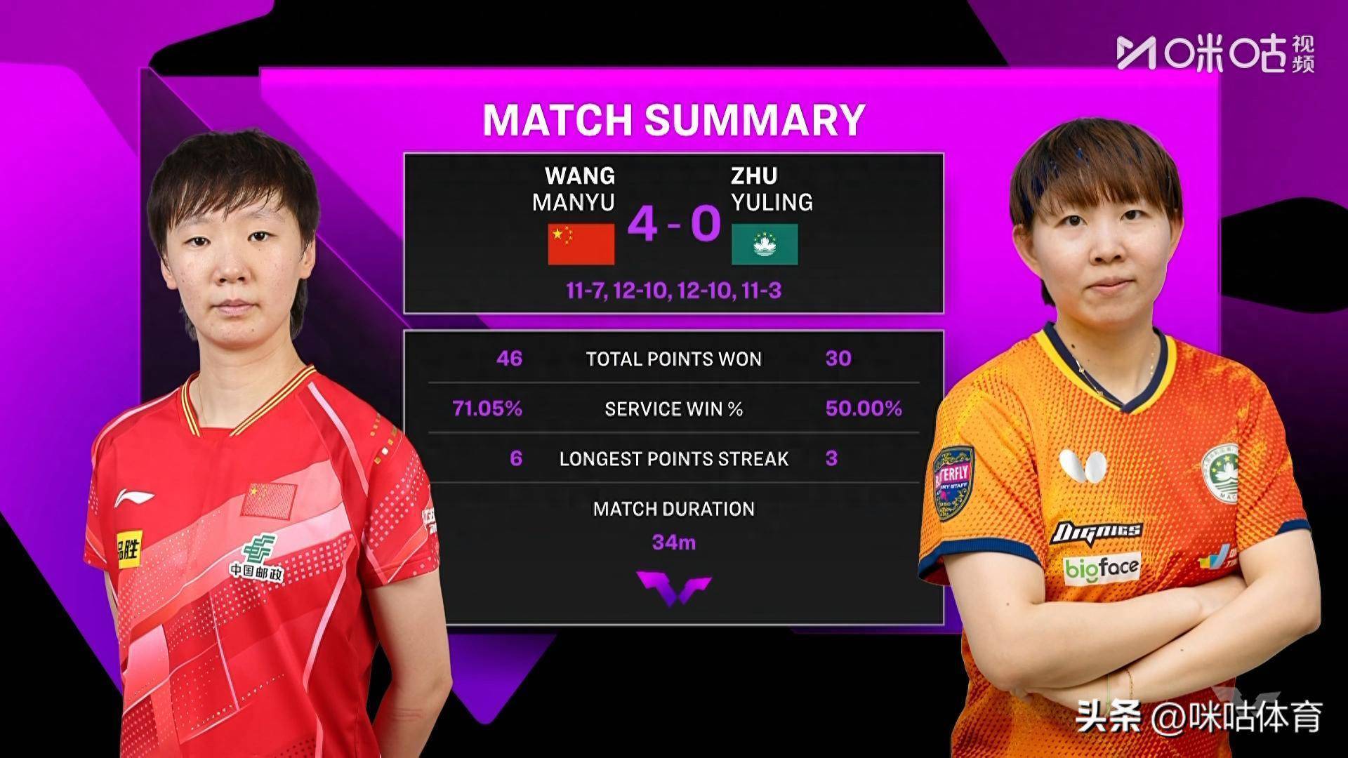 9月13日中国澳门,WTT澳门冠军赛女单1/4决赛,王曼昱对阵朱雨玲,两东谈主上一次交手王曼昱1-3不讨厌手,在驯顺早田希娜后,王曼昱本场的景色进一步进步,最终她4-0驯顺朱雨玲,晋级女单四强,比分为:11-7、12-10、11-8、11-3,半决赛王曼昱将濒临国乒队友陈幸同。