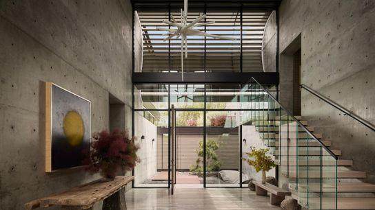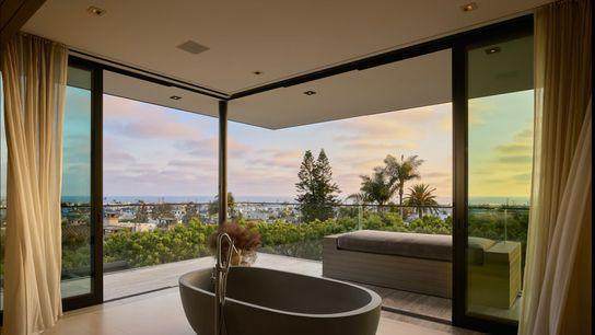 这处房产位于曼哈顿海滩的山丘区,占地逾8600闲居英尺,设有五间卧室。住宅继承当代格调,混凝土墙体、大面积玻璃、兼具巧妙与豁达视线,可尽览太平洋景观。